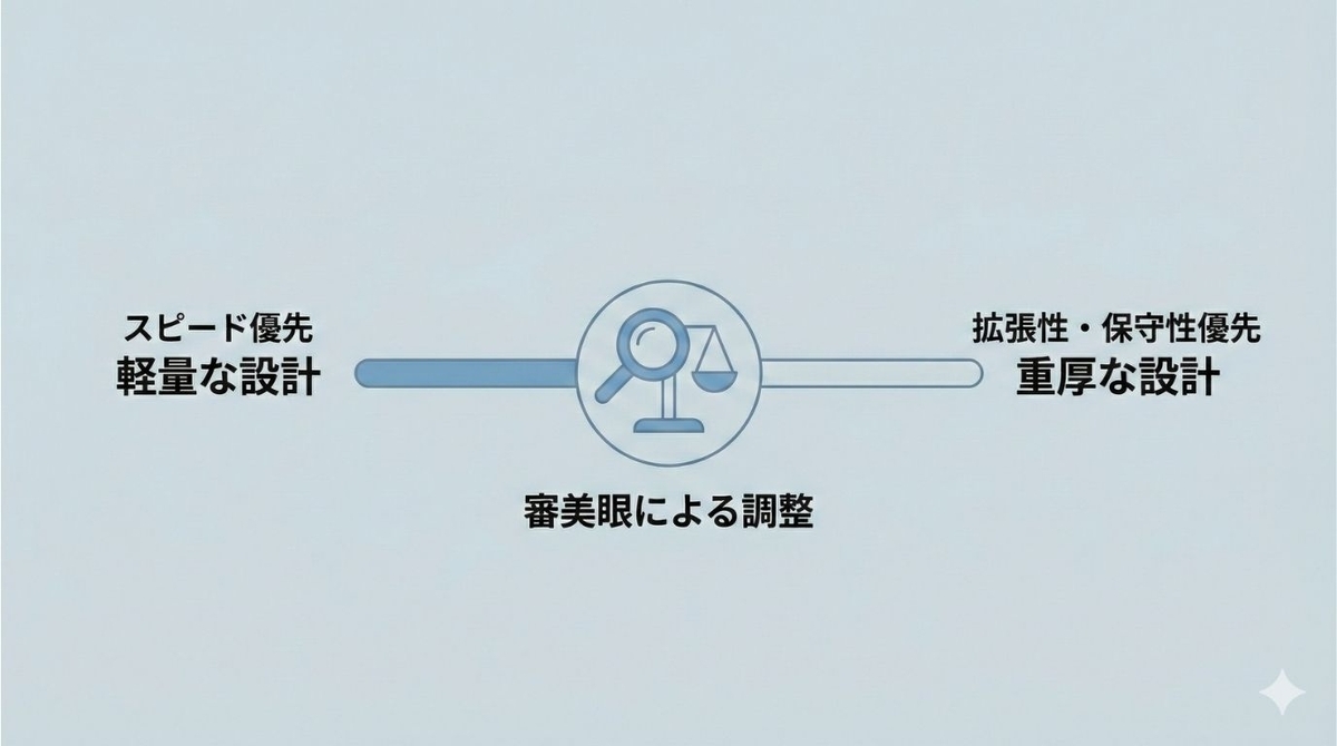 つまり、「全体を重厚に設計する」でもなく、「全く設計しない」でもなく、「必要な部分だけに設計を入れる」という判断です。これによって、スピードと将来の変更容易性の両立が図れます。